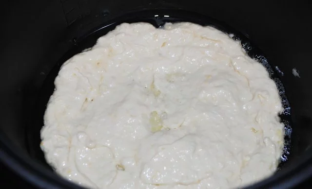 Теперь мы наливаем в чашу мультиварки немного растительного масла и включаем режим "Выпечка" и устанавливаем время 15 минут. Перекладываем наше тесто в мультиварку.