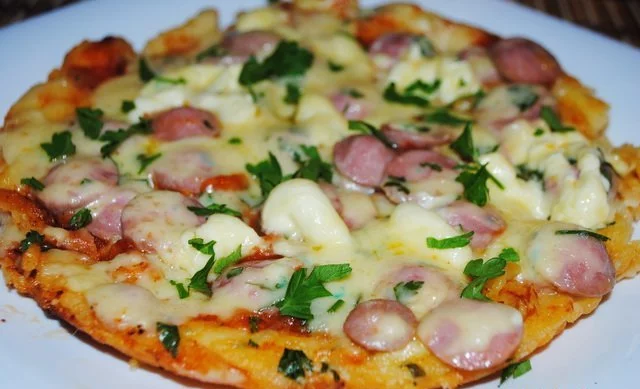 Далее, когда время прошло, смазываем основу для пиццы томатной пастой и майонезом и выкладываем кружочки сосисок. Добавляем сверху зелень и трём сыр. Опять выпекаем до готовности минут 15. Приятного аппетита!