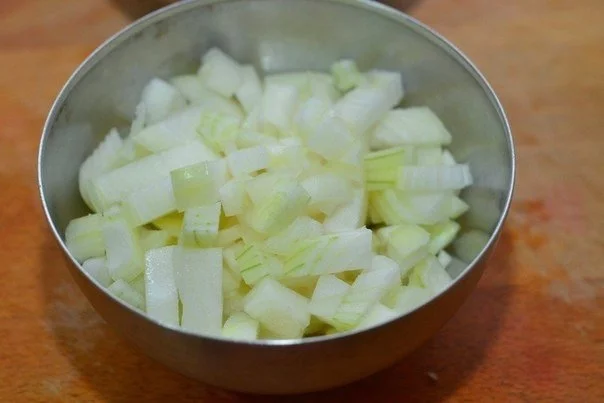 Очищенную луковицу нарезать кубиками.