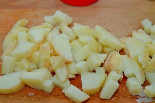 Остывший отварной картофель нарезать небольшими кусочками.