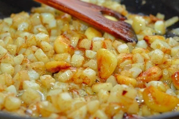 К луку и чесноку добавляем картофель и обжариваем все 5-7 минут до золотистого цвета