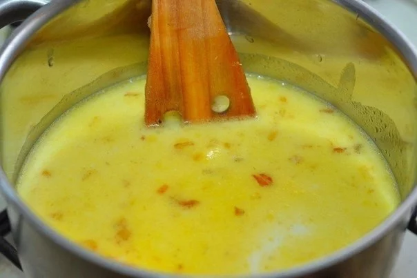 В кастрюлю вливаем куриный бульон и молоко, даем закипеть. Добавляем обжаренные овощи. Варим 15 минут.