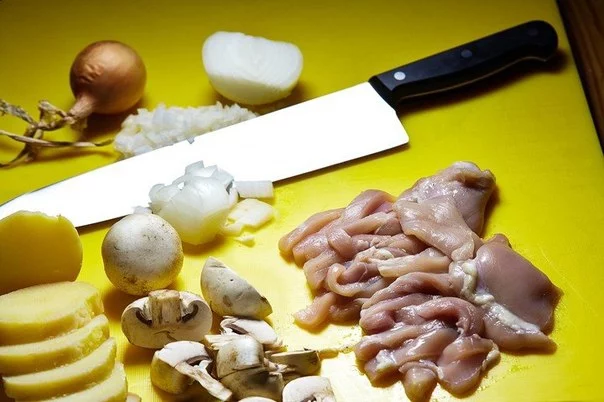 На подготовительном этапе необходимо нарезать мясо, отварной картофель и грибы. Луковицу нарезать небольшими кубиками.