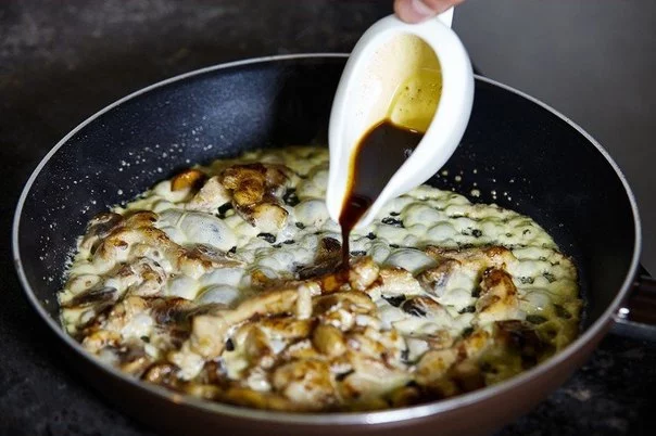 В сковородку влить соевый соус и 3ст.л. сливки. Тушить до загустения.