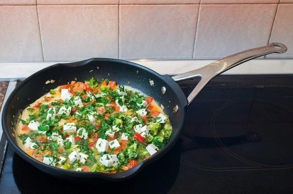 В сковородку с овощами выливаем 1/2 яичной смеси. Тушим на медленном огне 3 минуты. По всему периметру раскладываем сыр фета и выливаем ВЅ яичной смеси.