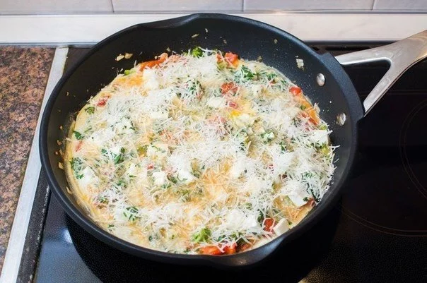 Тушим на медленном огне еще 3 минуты (до тех пор пока схватятся края омлета). Посыпаем сверху тертым твердым сыром и отправляем доходить до готовности в духовку примерно на 15 минут при температуре 200 градусов.
