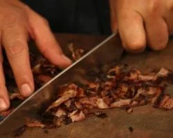 Положите бекон на бумагу для слива лишнего жира и нарежьте полоски на небольшие кусочки.