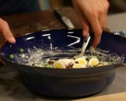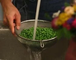 Горошек бланшировать в течение 1-2 минут в кипящей подсоленной воде, затем охладить в воде со льдом