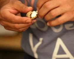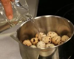 Майонез смешать с перцем и мелко нарезанным луком. Перепелиные яйца варить в течение двух минут.