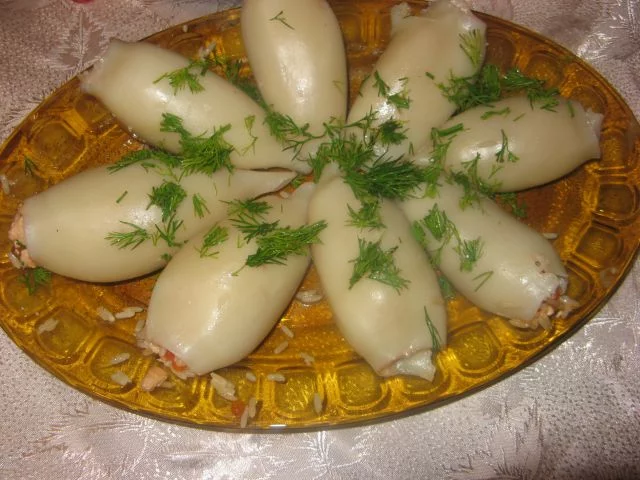Кальмара разделываем, снимая пленку, добавляем саке и заливаем кипятком в неглубокой посудине. Варим кальмара две минуты, затем отцеживаем воду на дуршлаге и насухо вытираем полотенцем. Отрезаем щупальца, а сами тушки слегка обрызгиваем рисовым уксусом.