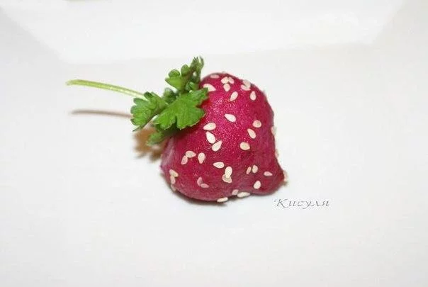 Смесью из оливкового масла и сока лимона взбрызнуть клубнички, а кунжутом украсить их, как вкрапления у настоящих клубничек. Из петрушки делаем хвостики у «ягоды».