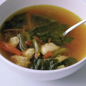 Затем фасоль выложить в кастрюлю с тушеной курицей, добавить два литра крутого кипятка, поставить на сильный огонь. Измельчить очищенную луковицу, зажарить до карамельного оттенка. Нарезать очищенные томаты маленькими дольками и выложить в кастрюлю с курицей и стручковой фасолью. Укроп, петрушку, базилик и кинзу хорошенько промыть теплой водой, порубить, также выложить в куриный суп.
