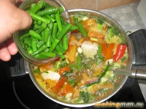 Тушить курицу сорок минут под крышкой, далее промыть и нарезать кусочками стручковую фасоль, выложить на сковородку, добавить тридцать миллилитров воды и тушить под крышкой пять минут.