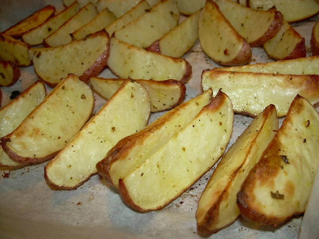 По истечении 20 минут, еще раз хорошо перемешайте картофель, чтобы дно покрылось оливковым маслом. Выньте блюдо из духовки. Дайте ему остыть. Нарежьте лук-резанец и посыпьте им блюдо. Можете подавать картошку с мясным стейком или салатом из свежих овощей.