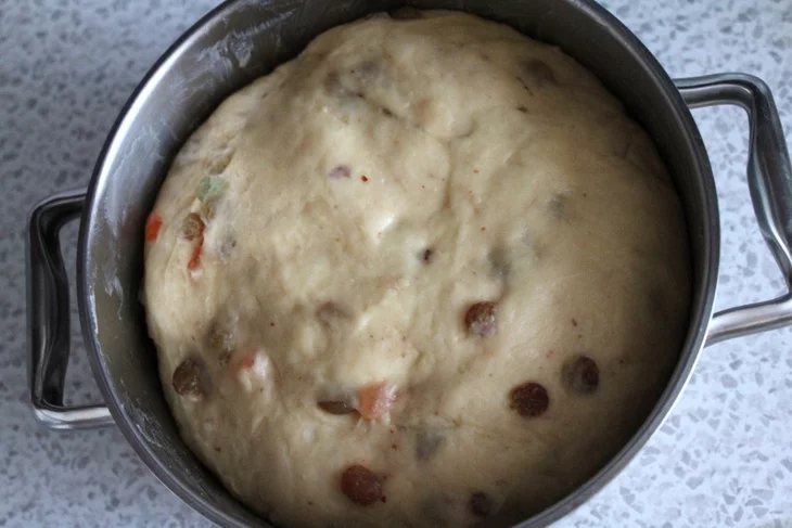 Оставшуюся пшеничную муку мы аккуратно просеиваем на чистый стол небольшой горкой. Растапливаем приготовленное сливочное масло и аккуратно выливаем в просеянную муку. Добавляем туда куриное яйцо, свежие желтки, сахар и йодированную соль. Тщательно несколько раз вымешиваем приготовленное тесто, примерно в течение 15-20 минут, пока мы не получим простую однородную эластичную массу. Замачиваем не спеша изюм в теплой воде. В приготовленное тесто мы добавляем опару и очень хорошо все вымешиваем. Добавляем затем туда же изюм и готовые цукаты, еще раз все хорошо перемешиваем. Берем небольшую кастрюлю или же очень глубокую круглую форму, тщательно ее смазываем любым растительным маслом. Перекладываем после этого в нее приготовленное тесто, накрываем аккуратно полотенцем и дальше оставляем на 4 часа. За это короткое время объем приготовленного теста должен у вас увеличиться вдвое.