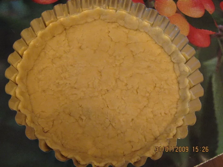 Когда приготовленное тесто полностью настоится, нужно будет аккуратно достать его из холодильника. После этого аккуратно разделите на две небольших части. Одну маленькую половину теста хорошенько нужно раскатать и выложить в хорошо смазанную любым растительным маслом форму для обычного выпекания. Сформируйте сначала бортики для нашего будущего пирога. Проколите просто тесто небольшой вилкой в нескольких местах. На приготовленное тесто аккуратно положите фасоль или же бобы, распределите их по всей поверхности равномерно. Поставьте приготовленное тесто выпекаться в, хорошо разогретую, духовку, примерно на 20-30 минут при обычной температуре около 200°С.