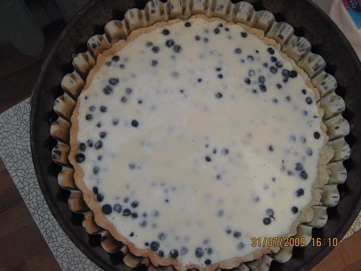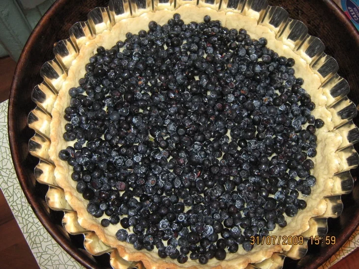 Вытяните из духовки приготовленное тесто, уберите с него все бобовые. Затем аккуратно выложите на заранее подготовленную основу всю черничную начинку. Из оставшегося теста постарайтесь сделать обычные жгутики, которыми вы, если захотите, сможете закрыть верх самого пирога в виде обычной решетки. Смажьте приготовленный пирог куриным яйцом и после этого запекайте его около 20-30 минут до образования на нем золотистой корочки. Приятного вам всем аппетита!!!