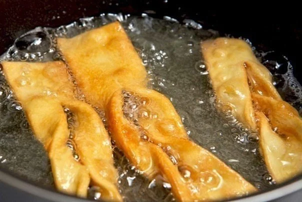 После всех этих действий, хворост готов для прожарки. Что касается прожарки, то она не должна быть долгой, за продуктом нужно следить. То есть на сковородку выкладывается несколько штук готовых хворостин и прожаривается, как только все готово, то есть приготовлено сверху на изделие сыпется сахар или сахарная пудра.
