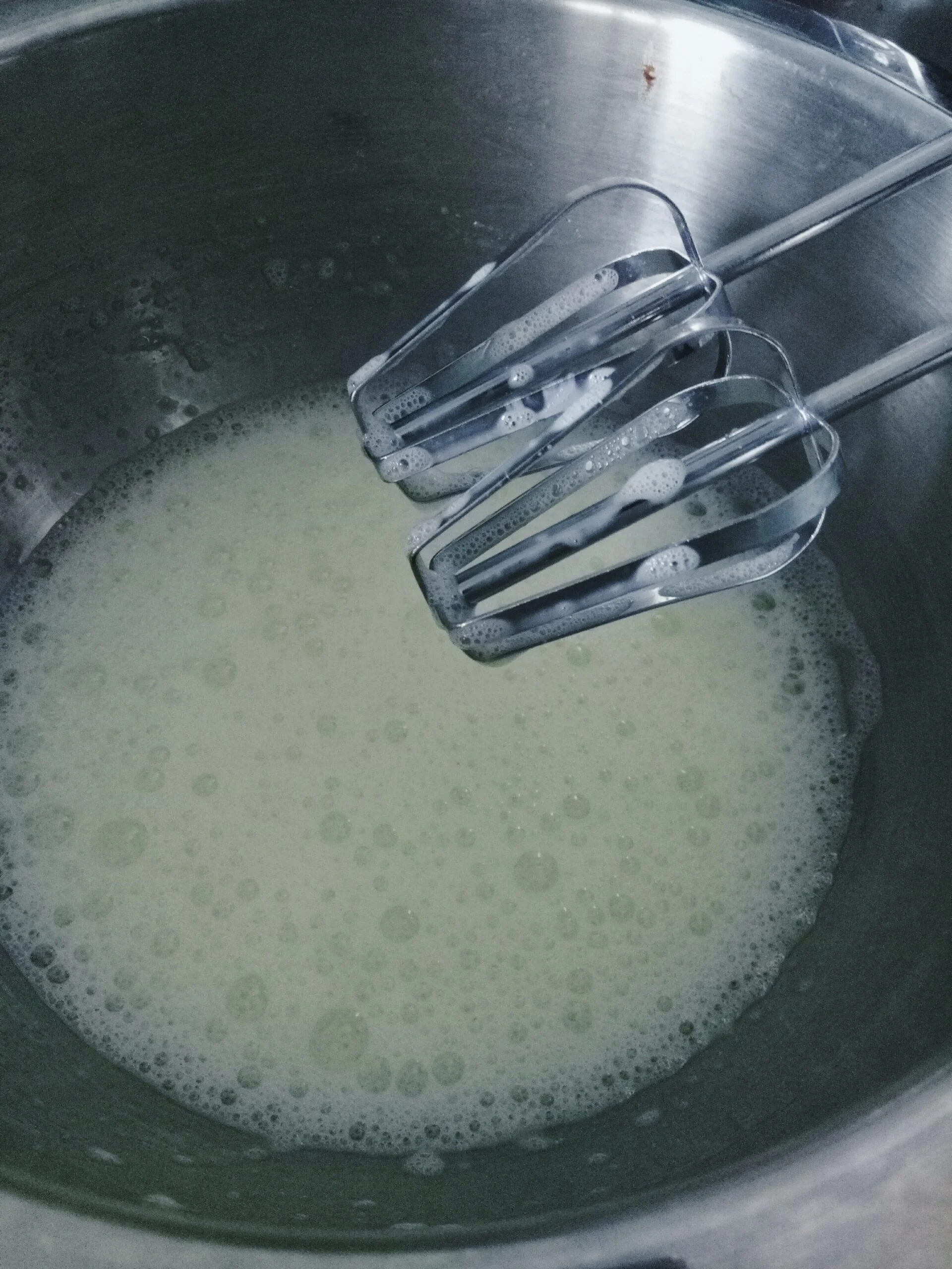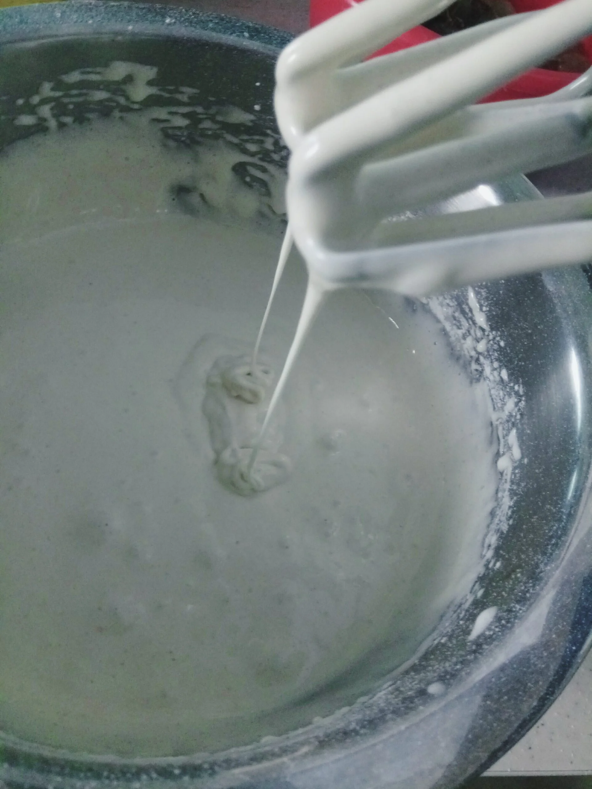 Муку добавить в общую емкость, а затем миксером смешать все до получения теста консистенции густой сметаны.