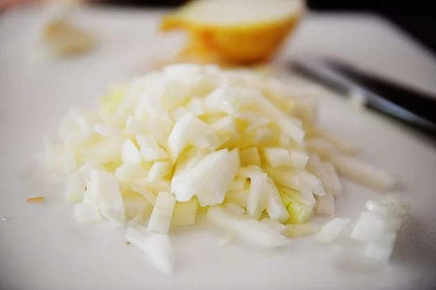 Пока готовиться фасоль, приготовьте овощи. Нарежьте кубиками луковицу.