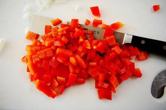 Красный сладкий перец тоже нарежьте кубиками.
