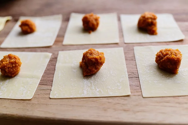 Тесто раскатать тонкими пластами. Нарезать квадратиками 4-5см. В середину положить тыквенное пюре.