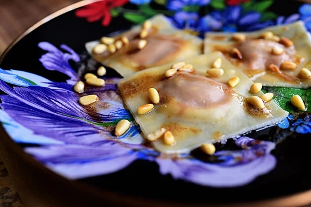 Готовые равиоли выложить на тарелку. Полить растопленным сливочным маслом и украсить орешками.