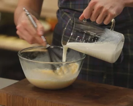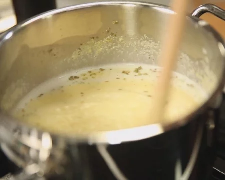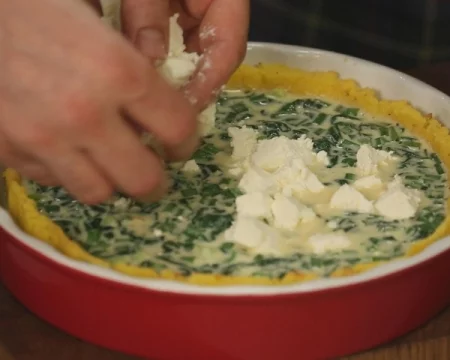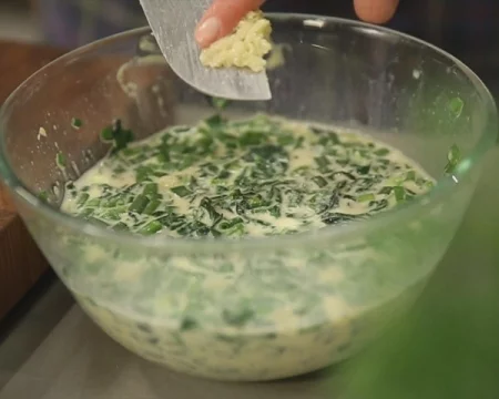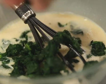 Шпинат бланшируйте в кипящей подсоленной воде, затем в ледяной. Слейте жидкость и добавьте шпинат к молочно-яичной смеси.