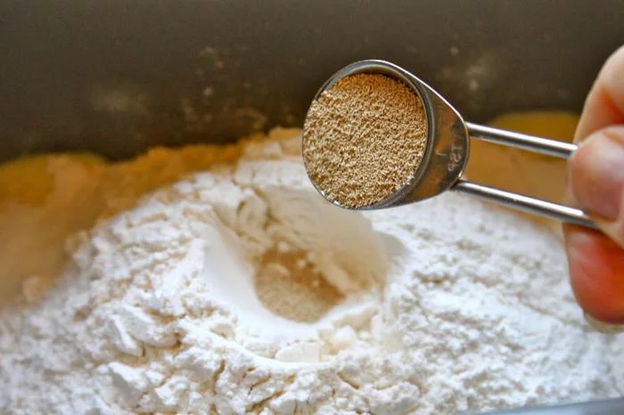 80 г муки соединить с 10 граммами сухих дрожжей, добавить соль на кончике ножа, влить 100 миллилитров теплого молока и 25 мл сливок, ввести 1 желток и приготовить гладкое тесто.