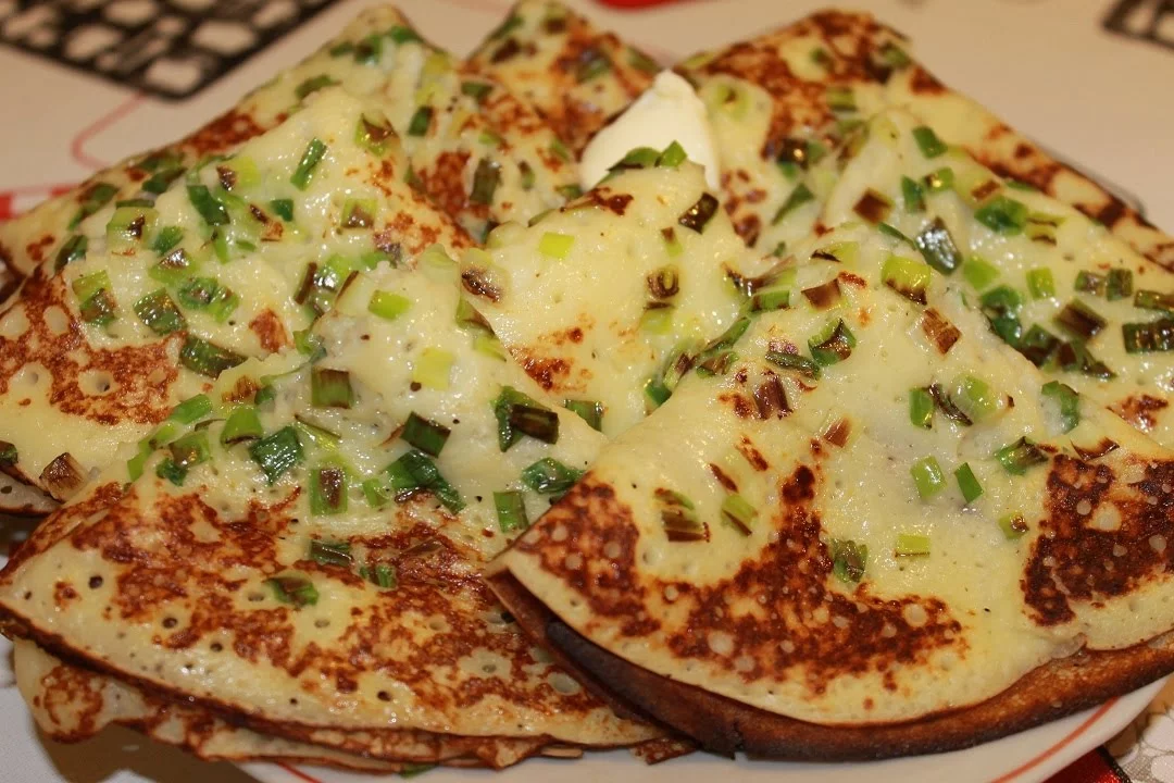 Выложить несколько кружков лука на сковороду и вылить на них по 1 стол. ложке теста. Когда блинчики подрумянятся, перевернуть. Блюдо подать горячим со сметаной с рубленой зеленью или паприкой.