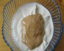 Для приготовления соуса смешайте ореховую массу со сметаной, добавьте немного соли. Все тщательно перемешать.
