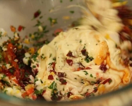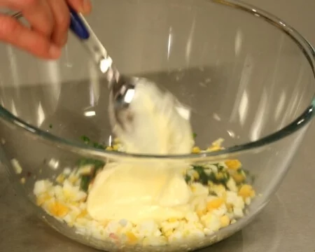 Для приготовления соуса для салата следует измельчить и смешать лук, огурцы, яйцо, зелень. Все перемешать с майонезом, добавить вустерский и острый соус.