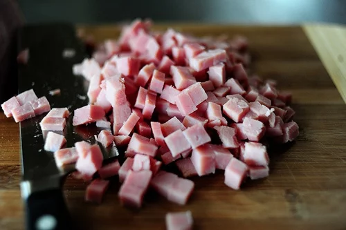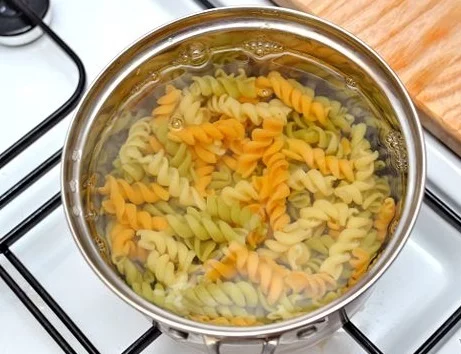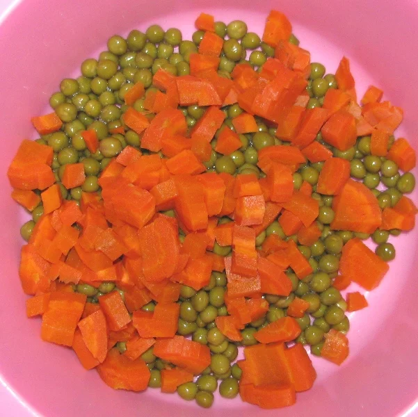 Если у вас замороженные горошек и морковь, отварите их до готовности в подсоленной воде. Свежую же морковь, нарежьте небольшими кубиками и также отварите до готовности.