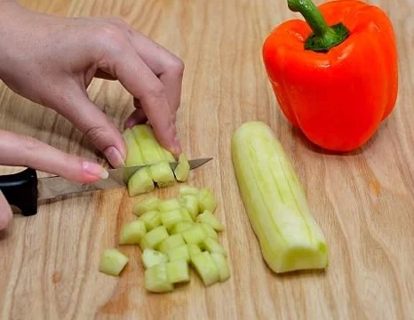 Следом нарежьте огурец кубиками или небольшими кубиками. Луковицу нарезаем полукольцами.