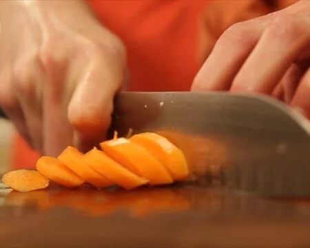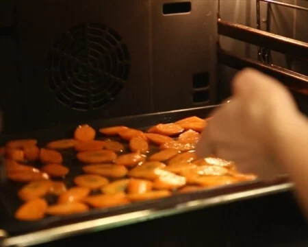 Залейте приготовленным соусом морковь, выложите ее на противень с антипригарным покрытием. Выпекайте около 15 минут, в предварительно разогретой до 190 градусов духовке с вентилятором.