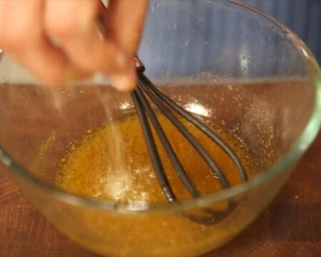 Смешайте сок лимона и апельсина. Добавьте карри, мед, оливковое масло, перец и тщательно все перемешайте.