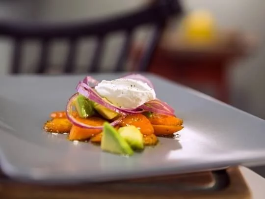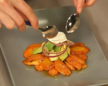 Выложите на плоскую тарелку морковь, сверху положите авокадо и лук, залейте остатками соуса. Можете украсить сверху кремом.