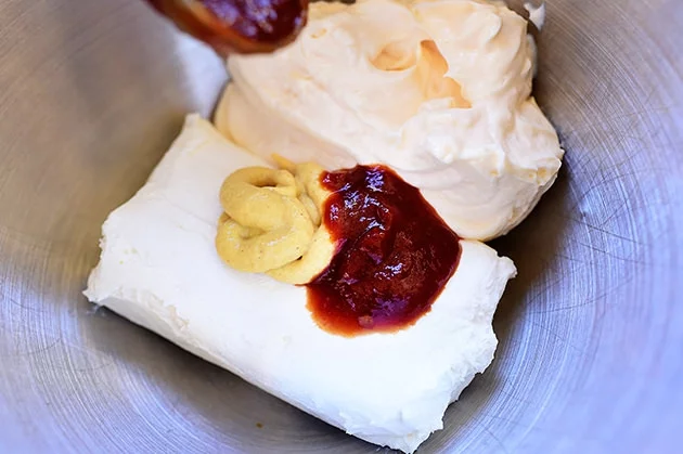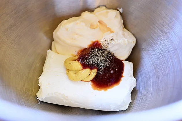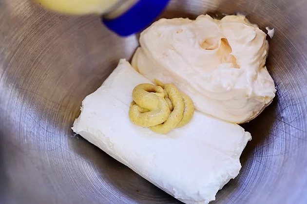 В чащу миксера или блендера сложить мягкий сливочный сыр, майонез и дижонскую горчицу.