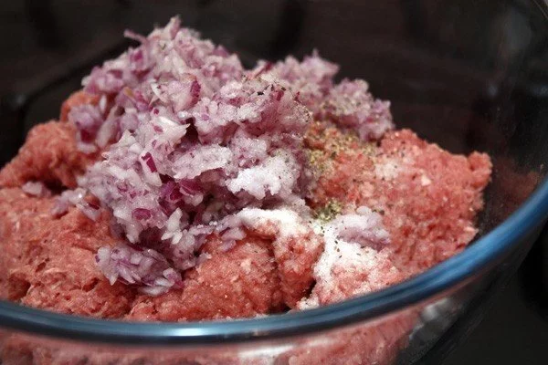Луковицу мелко нашинкуйте и смешайте с фаршем. Хлеб добавьте к фаршу, посолите и поперчите массу. Не ленитесь и хорошо вымешивайте фарш до однородной массы.
