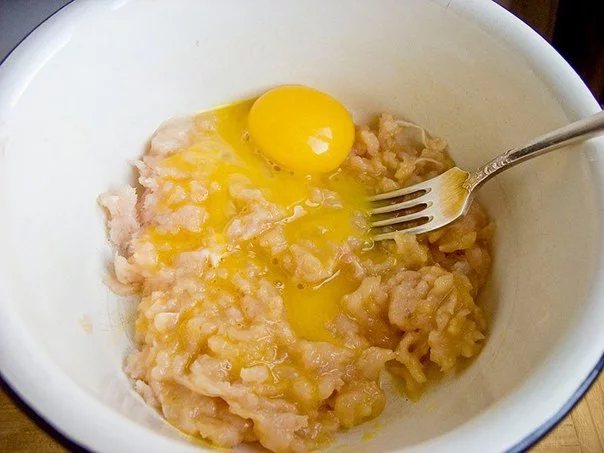Изначально необходимо приготовить фарш, куда добавить желтки яиц, перец, воль и специи. Все перемешиваем максимально тщательно.